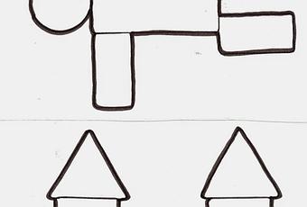 Durante el primer trimestre les dejé en varias ocasiones los bloques lógicos en la mesa del rincón para manipularlos libremente. Los amontonaron, los pusieron en fila, cubrieron con ellos espacios de la mesa y los clasificaron por formas y colores. En el segundo trimestre, una vez que estuvieron familiarizados con el material y el funcionamiento de los rincones, hice unas plantillas para construír con los bloques árboles, coches, animales, etc. En los dibujos se marcaba con rotulador más grueso el contorno de la figura y con rotulador más fino las piezas que tenían que usar para cubrirla. Buscando la figura que era igual en forma y tamaño de ese "subespacio" llegarían a la figura "global".