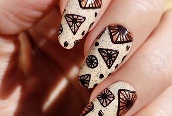 Hice reverses con este diseño de uña completa, que tiene cuadrados, triángulos y círculos con un punto en el centro y rayitas. Y se completa con unos pequeños corazoncitos desperdigados. Estampé en marrón y coloreé cada una de esta figuras de un color diferente. Pero todo en tonos marrón/naranja, que se me apetecía este tipo de colores.