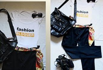 Ya habíamos visto la T-shirt de "fashion blogger". El día 1 la lucí con pantalón negro de gabardina -Desiderata-, Sandalias -Prüne-, Bandolera -Ricky Sarkany-, Pañuelo como cinto -Hermès-, Gafas -Up Town-.