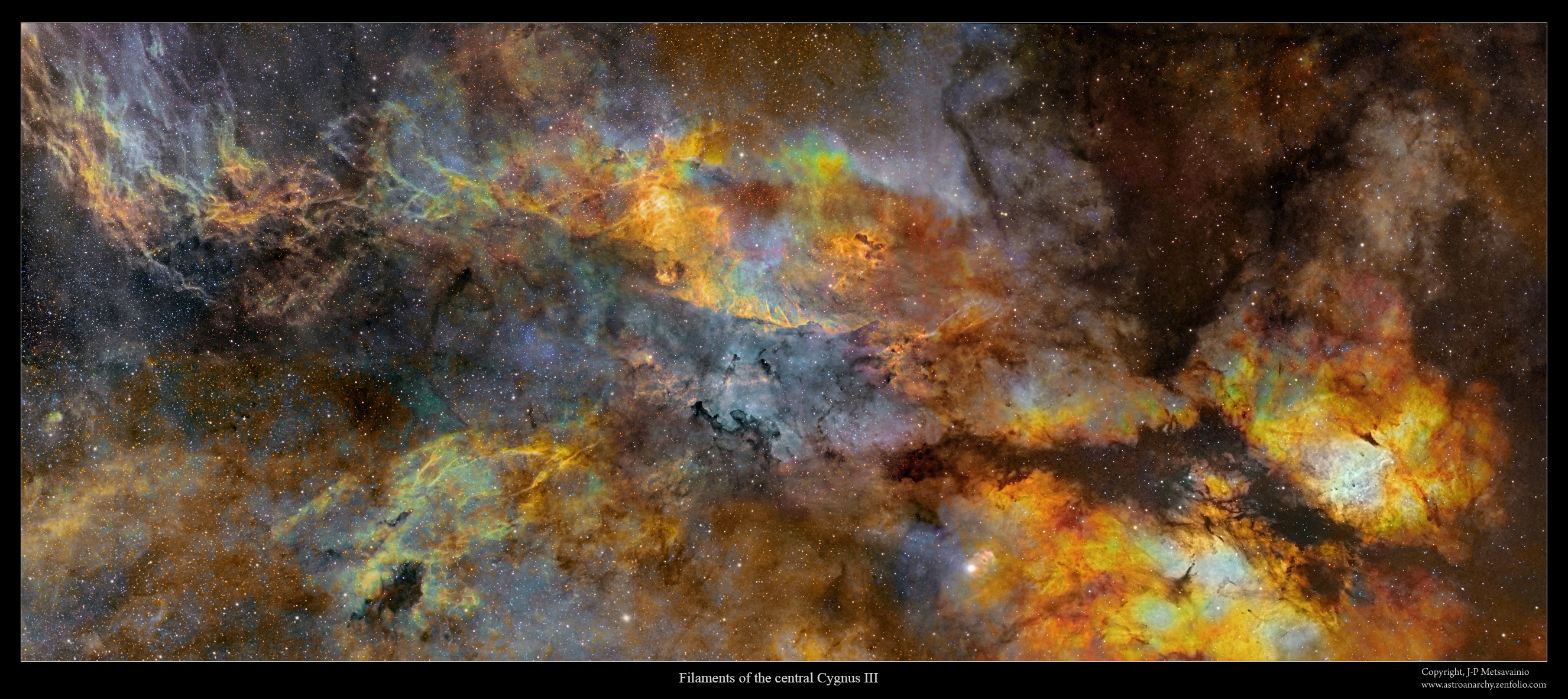 La espectacular Constelación del Cisne, llamada también en ocasiones La Cruz del Norte, es una de las más hermosas regiones de todo el cielo de la Tierra. Contiene brillantes estrellas, entre las que hallamos la supergigante blanca Deneb, que es uno de los vértices del famoso Triángulo de Verano. En ésta imagen lograda por el astrofotógrafo JP Metsävainio, podemos ver el centro de la constelación, cuyos filamentos esculpen toda la región de material interestelar. En el Cisne podemos contemplar sorprendentes nebulosas, entre las que destacan la Nebulosa Norteamérica, la del Pelícano, la de la Mariposa y la del Velo (que es el resto de una antiquísima supernova). También abundan ricos campos estelares con multitud de estrellas jóvenes y muy calientes, glóbulos de Bock, cúmulos abiertos pertenecientes al Catálogo Messier, como M29 y M39, o una intensa fuente de radiación, el llamado Cygnus X-1, que completan un paisaje que merece no una, sino muchas noches de observación en detalle, en una zona del cielo surcada por el Brazo de Orión de la Vía Láctea, que es una región externa, en dirección contraria al centro galáctico, donde se encuentra Sagitario.