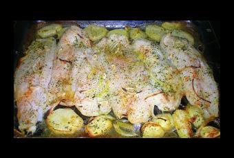 Colocar en la bandeja refractaria los filetes de Merluza, picar las papas en rodajas, la cebolla el ajo y esparcirlos por encima.