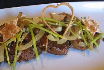 2º " Pasado este tiempo la sacaremos de la nevera y la pasaremos por la plancha, en su defecto por una sartén. La hacemos a nuestro gusto, al punto muy echa, en fin como más os guste. De todas formas deciros que el vinagre y la salsa de soja ya la ha cocido un poco, por lo que os aconsejo que no la hagáis demasiado.3º Cortamos la cebolla en juliana y la pasamos por la sartén hasta que quede pochada, y la reservamos en papel de cocina para que escurra el exceso de aceite.
