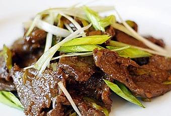 2. En el mismo wok, calentar 1 cucharada de aceite y agregar el ajo y el jengibre para aromatizar y luego retirar. Añadir la carne de nuevo en el wok y luego los ingredientes para la salsa. Continúe sofriendo hasta que los trozos de carne estén casi hechas, a continuación, añadir los cebollines. Haga movimientos rápidos y rectifique la sazón. Sirva bien caliente.