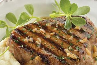 4. Para llevar a la mesa, coloca una cama de puré de papa y sobre ella la carne. Adorna con las hojas de verdolaga.