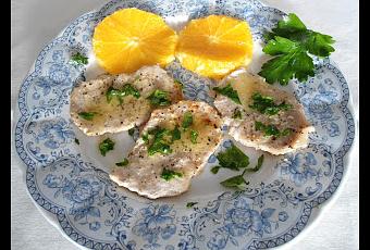 Hacer un adobo con el aceite, el zumo de naranja, el ajo picado y una pizca de sal, dejar los filetes en esa salsa aproximadamente una hora.