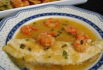 INGREDIENTES PARA 4 PERSONAS4 filetes de gallo de San Pedro.24 gambas medianas.PARA LA SALSA100 ml. de fumet de pescado.50 ml. De jerez muy seco.50 ml. De agua.1 cebolla grande.4 dientes de ajo.Perejil fresco.Aceite de Oliva Virgen Extra.Sal.