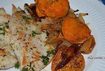 Precalentamos el horno a 150 grados.Mientras en una fuente apta para horno, ponemos la cebolla pelada y cortada en juliana lo más finamente posible, pelamos el boniato, lo cortamos en láminas finas y lo ponemos encima de la cebolla, espolvoreamos la mezcla con cinco especias, sal y un chorro de aceite de oliva. Metemos al horno y lo mantenemos una hora mas o menos.