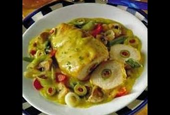 Haga incisiones en los filetes de pechuga e introduzca las aceitunas rellenas (1 taza aproximadamente). Corte en rebanadas el resto de aceitunas y reserve. Sazone los filetes con sal y pimienta y dore en el aceite, añada las aceitunas reservadas y el vino blanco. Deje hervir por 5 minutos, destapado. Agregue la mostaza disuelta en 2 tazas de agua fría. Mezcle y deje cocinar a fuego suave y semi tapado por 20 minutos aproximadamente, dando vueltas la carne y mezclando de vez en cuando. Sirva acompañado de puré de papas o arroz.