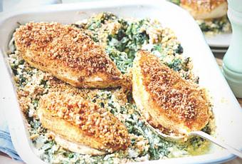 Esta receta de filetes de pollo rebozados con nueces sobre espinacas y curry es muy fácil de elaborar.