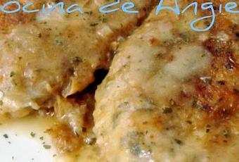 - Freír cebolla y batirla con 2 dientes de ajo, perejil, 1 cdta. de harina y una chispa de agua. Poner los filetes en la misma sartén con una chispa de aceite, un chorro de vino blanco y la salsa, y cocer todo junto a fuego lento unos 15´.