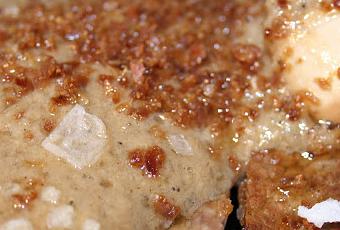 Servir la salsa con los filetes y el champiñón suelto. Yo he añadido sal en escamas y un poquito de jamón serrano deshidratado y troceado que tenía.