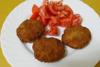 - Ponemos en un cuenco pequeño un poco de aceite y en un plato hondo el pan rallado. Nos untamos las palmas de las manos con aceite. Tomamos con una cuchara masa y hacemos una bola con las manos que luego aplastamos y pasamos por pan rallado, y dejamos reposar en una bandeja hasta terminar con toda la masa.