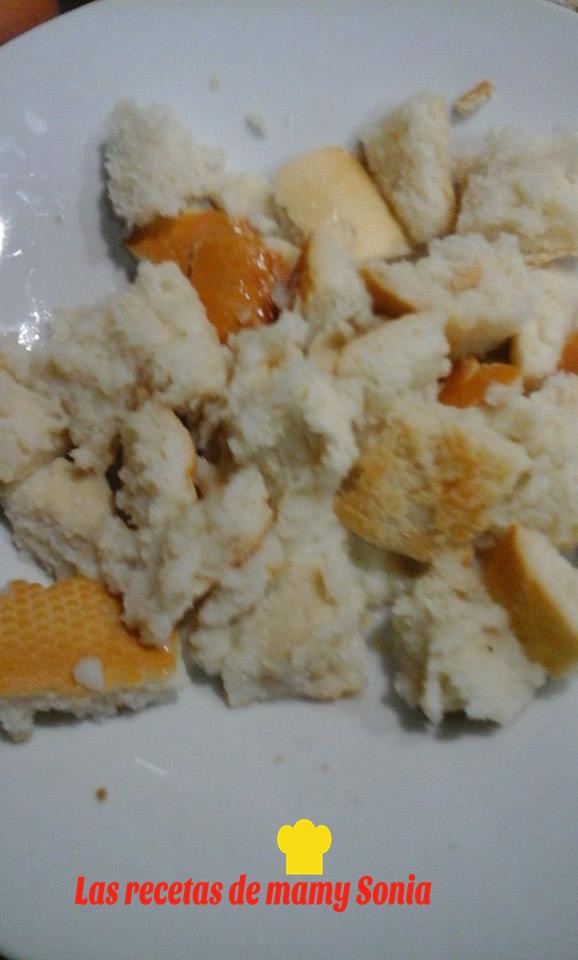 Ponemos en remojo las rebanadas cortadas en trocitos.