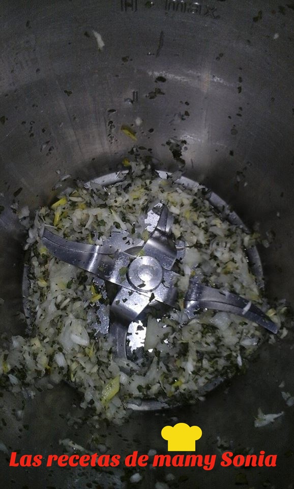 Pelamos la cebolla y el ajo, los ponemos en el vaso junto con el perejil lavado y picamos 5 seg/vel 5. Bajamos los restos y si lo queremos más picado volvemos a programar 2 seg a la misma vel.