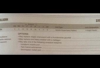 Voy a empezar el día con ganas y energía.Y para ir abriendo boca una nuevas filtraciones de la renovación del codex Knights Imperiales(De la cual luego hablare).Se han filtrado desde B&C principalmente(Y se pueden ver también en BoLS) bastantes cosas del nuevo codex a pocos días de su venta en abierto,que pueden agrupar en perfiles y opciones de los Knights(Nuevos y viejos) y formaciones.Todo esta en inglés y las fotos no son muy buenas(De hecho son fotos parciales en buen numero) pero son imágenes aun así muy interesantes y validas.Son estas: