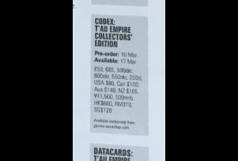 La tarde se anima. Otra filtración mas de la White Dwarf de Marzo, que sumamos a la anterior. La segunda semana de Marzo es para los T'au. Desde BoLS , B&C y recopilado ademas desde diversas fuentes como Spikey Bits tenemos mas filtraciones de la WD de Marzo, en este caso precios de los lanzamientos de los T'au.