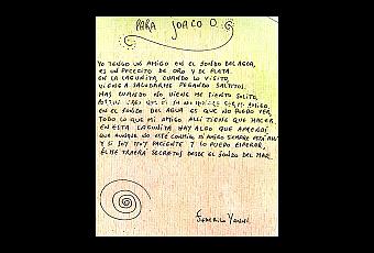 Yo tengo un amigo en el fondo del agua, es un pececito de oro y de plata. En la lagunita cuando lo visito, viene a saludarme pegando saltitos. Más cuando no viene me siento solito porque creo que él ya no quiere ser mi amigo. En el fondo del agua es que no puedo ver, todo lo que mi amigo allí tiene que hacer. En esta lagunita hay algo que aprendí, que aunque no esté conmigo mi amigo siempre está ahí y si soy muy paciente y lo puedo esperar, él me traerá secretos desde el fondo del mar.Sencillo, y sin embargo describe a Joaqui de una forma increíble.