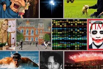 En sentido de la lectura occidental: fotograma de Sen to Chihiro no kamikakushi; Plutón (en el centro de su imagen); fotograma de Grizzly man; P. Hilton; la Amsterdam de Second Life; detalle del mapa del genoma humano; Obama Joker; M. Phelps; Aung San Suu Kyi y ceremonia olímpica en Beijing.