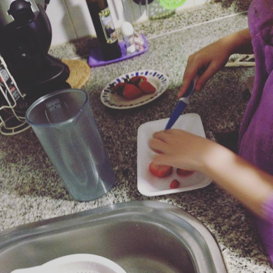 Ya de vuelta a casa pasamos por un super, por aquello de comprar algo para cenar, y aprovechando Alejandra se compró una cesta de fresas..., y nada más llegar a casa se puso a prepararse un batido (que por cierto salió divino).