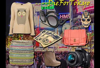 Para hacer el look,me imaginé que es lo que me pondría yo para pasear por la ciudad así que mi decisión fue esta porque allí la gente viste con mucho estilo, y con prendas muy tendencia,por eso elegí una falda con aplicaciones brillantes y colores pastel, un jersey de punto con un buhito,y una cartera satchel,tan cómoda a la hora de hacer turismo ya que se puede llevar colgada o como bandolera! El calzado,un botín que queda fenomenal con todo,y al ser con cuña podemos andar por la ciudad luciendo esbeltas y sin cansarnos,y para finalizar con los complementos no pueden faltarnos unas gafas de sol,que nunca se sabe...estas son de Prada,y un anillo en forma de calavera en tonos azules.No podemos pisar un país sin haber canviado la moneda,allí es el yen, cuando te escapas a una ciudad de esas características siempre se suele guardar un día para ir de shopping ;)E importantísimo también no dejarme mi camara, me encanta hacer fotos,e imaginandome que estoy allí creo que lo fotografiaría todo