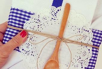 Quise envolver este libro con elementos de culinarios... así que utilicé un paño de cocina debidamente doblado y prendido con un imperdible y luego decorado con una faja de un retal de tela de cuadrito vichy en azul (un estampado muy utilizado en la cocina), rematado con una blonda de pastería y una cuchara de madera atada con bramante (también muy utilizado en cocina para atar asados por ejemplo.