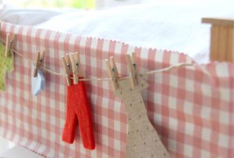 La forré con una tela de cuadro vichy en tonos rosas y la decoré con una cuerda a modo de tendedero y en él prendí con pincitas de madera diversas piezas de ropa que dibujé y recorté en fieltro.