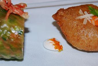 CROMESKI DE CASTAÑA: Se hace un puré de castaña y se meten en moldes de bombón. Se congelan. Una vez están congelados, se sacan los bomboncitos de castaña, se pasan por una tempura y se fríen en abundante aceite caliente. Luego se hornean durante 2 minutos.