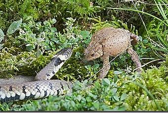 Veamos esta foto, una culebra de collar (Natrix natrix) decide merendarse al otrora protagonista de la fotografía, un sapo común. Si bien el anfibio está bien protegido contra el ataque de, por ejemplo, un perro gracias a el veneno que emiten a través de sus glándulas parietales, en esta situación tiene un problema: la culebra de collar es inmune a este. Así que el sapo opta por aparentar ser más grande de lo que es, para ello se infla y estira las patas e, incluso, se inclina levemente sobre un costado con la esperanza de que la culebra se percate de la imposibilidad de engullirla. Esto parece resultar bastante efectivo, es común que el ofidio acabe descartando al sapo como comida.
