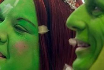 Esta vez Fiona y Shrek, conocidos personajes de la pelicula de dibujos animados han sido caracterizados por una pareja de la vida real. Heidi y Paul decidieron hacer esta locura el día de su boda debido a la afición que sienten los dos por estos personajes y así que se disfrazaron de estos personajes y lo dieron todo para celebrar una boda a lo grande y de lo más original.