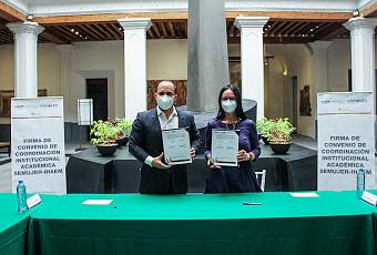 Toluca, Estado de México.- Para continuar con las acciones que el Gobierno del Estado de México, encabezado por Alfredo Del Mazo Maza, promueve a favor de las mexiquenses, se realizó la firma del convenio de Coordinación Institucional Académica entre la Secretaría de la Mujer y el Instituto Hacendario del Estado de México (IHAEM), con el que se busca asegurar y maximizar la calidad de los proyectos y programas que brindan atención y acompañamiento.