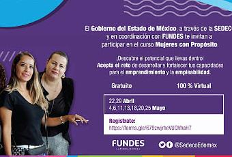 El Programa “Mujeres con Propósito” busca empoderar económicamente a mujeres mexiquenses, así como de Latinoamérica, a través de un Programa de Educación, Empleabilidad y Emprendimiento, cuya convocatoria estará abierta a partir de esta fecha y hasta el próximo 21 de abril a través del formulario de inscripción: https://forms.gle/679zwjrheVUQVhaH7.