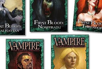 La editorial británica de cartas (Asentada en Nottingham, por cierto) Black Chantry Productions, presentó antes de ayer en su página web y cuenta oficial de Twitter la serie de mazos pre-construidos para el JCC Vampire the Eternal Struggle, First Blood.
