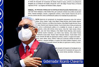 La Fiscalía Provincial Corporativa Especializada en Delitos de Corrupción de Funcionarios de Huaura, luego del megaoperativo que culminó con la detención de ocho funcionarios y proveedores del Gobierno Regional de Lima, investigados por la presunta realización de actos irregulares en los procesos de contratación de bienes y servicios que les habría permitido apoderarse de más de S/ 1 millón, resolvió no formalizar denuncia alguna contra el titular del pliego – Ricardo Chavarría Oria – por la presunta comisión del delito contra la administración pública en la modalidad de peculado doloso.