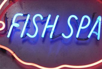 Se trata de un masaje de pies y piernas, en el que unos adorables pececitos te comen la piel muerta al meter los pies en su pecera. Toma ya!