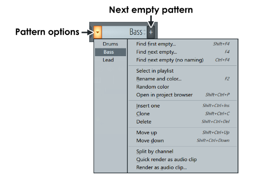 Por cada nuevo canal que introduzcas en el Channel Rack (ver más abajo) deberás crear un nuevo Patrón (Pattern) con el signo "+". que será en el que introducirás las notas en el Piano Roll. Después, en la Playlist verás que tendrás todos los patrones que has creado a tu izquierda y los podrás añadir a los canales del grid.