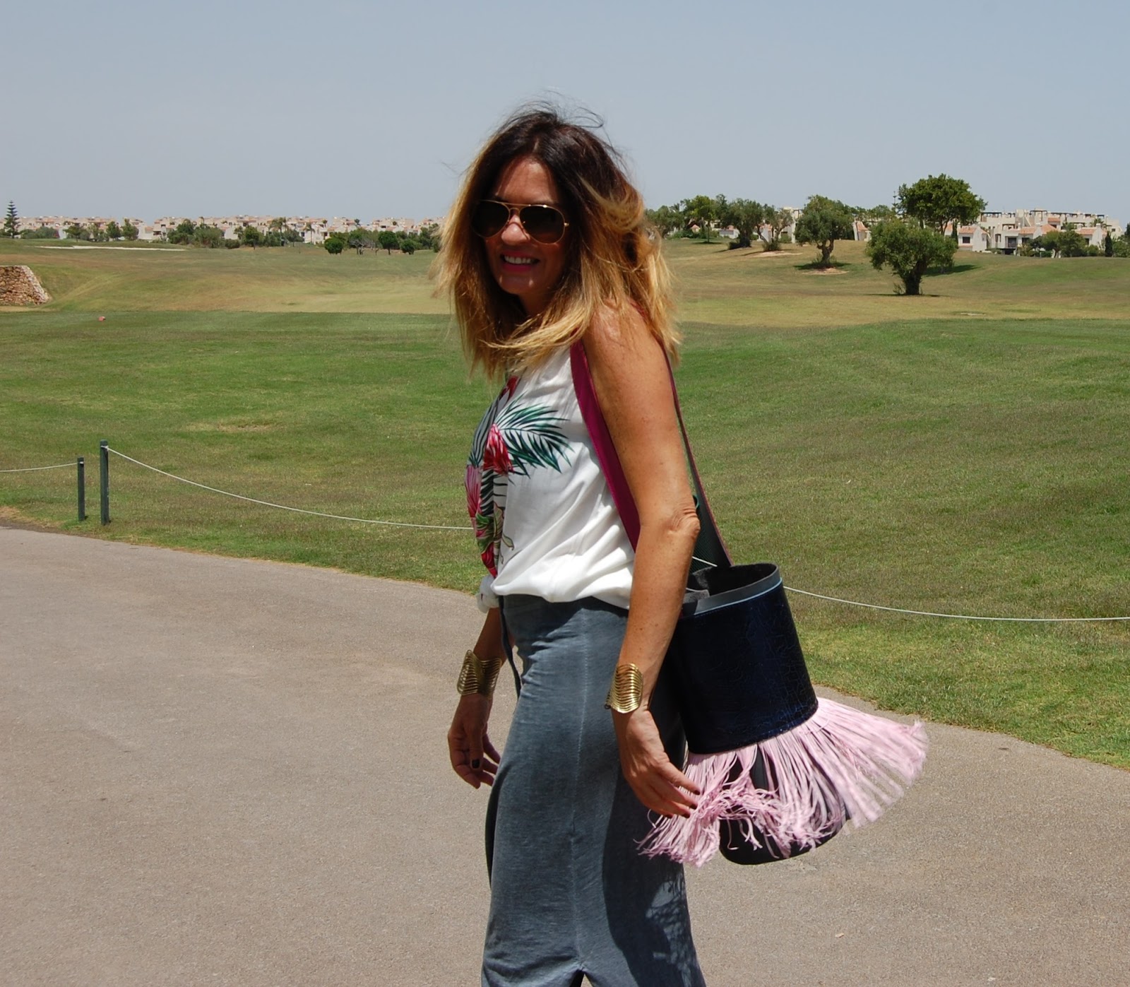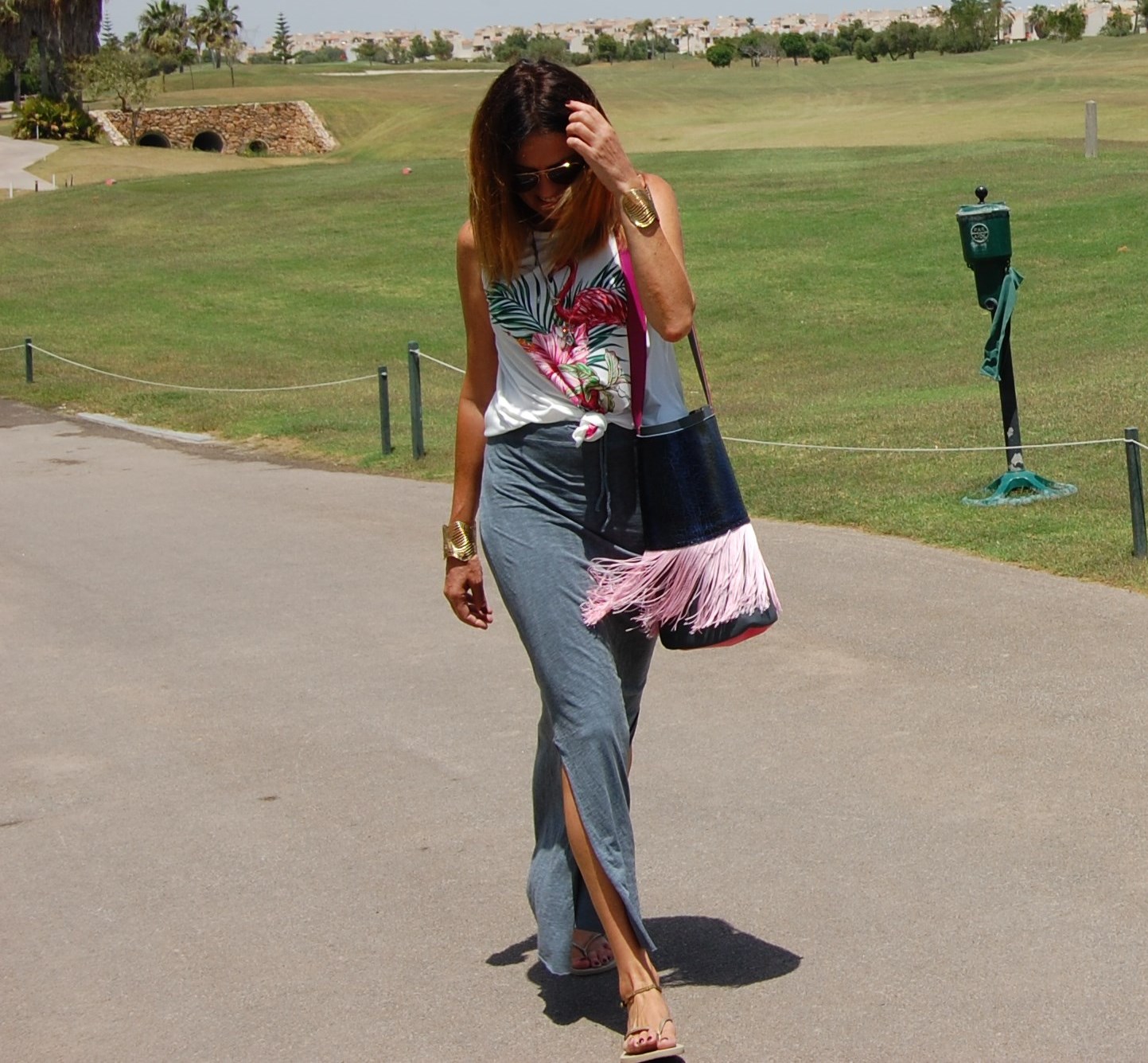 Camiseta print floral y flamenco de Petit Moly ideal, suelta y anchita como a mi me gustan para poder anudar y máxi falda sporty también de Petit Moly.