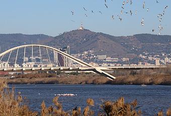 Vista panorámica del tramo final del río Llobregat, con el puente Nelson Mandela al fondo y una bandada de flamencos en medio del cauce.