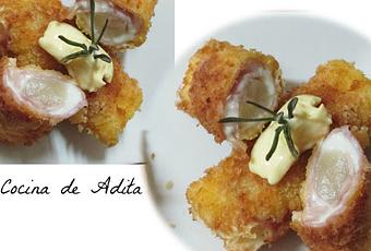 Sobre el queso, ponemos la punta de esparrago, (que ya teníamos sobre papel de cocina, para que este lo mas seca posible) los enrollamos, no suele hacer falta palillo, para que se mantengan enrollados, si vemos que se abre se lo ponemos.