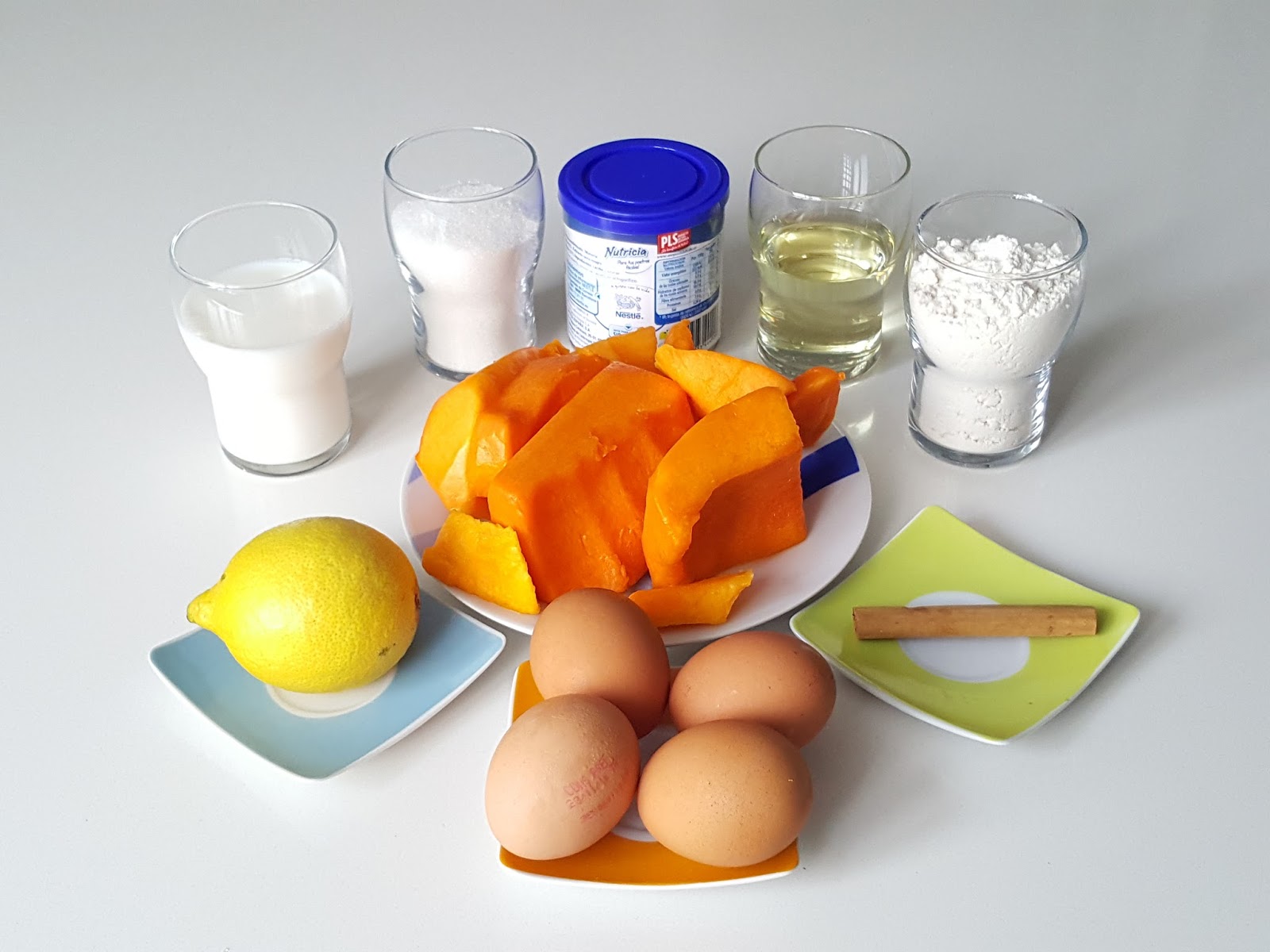 500 gr de calabaza4 huevos1 lata pequeña de leche condensada1/2 lata de aceite de girasol (100 gr)1 lata de leche (150 gr)1 lata de azúcar (150 gr)1 lata de harina (100 gr)1 rama de canelaun limón1 sobre de levadura química (16 gr)