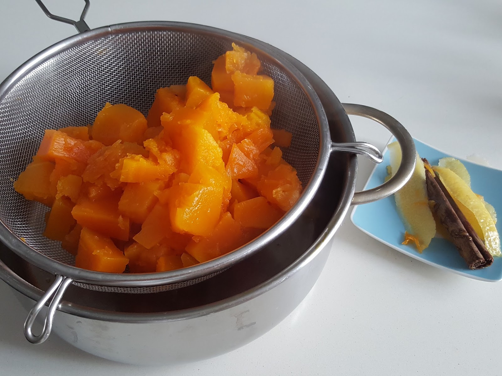 1. - Troceamos la calabaza pelada y la ponemos a hervir en una cazuela con agua, la piel de medio limón y una rama de canela. Unos 15 minutos, hasta que esté tierna.