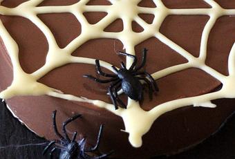 Para preparar la decoración con la tela de araña fundimos chocolate blanco al baño maría y rellenamos un biberón con él. Con un rotulador, dibujamos la tela de araña en un papel de horno y le damos la vuelta (para que la tinta quede hacia abajo). Con el biberón vamos dibujando sobre el papel. Cuando terminamos el dibujo, lo introducimos en el frigorífico hasta que se solidifique y se desprenda del papel sin romperse.