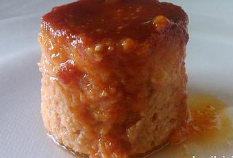 - Vertemos el caramelo en la flanera o flaneras, dejamos enfriar un minuto y añadimos la mezcla de la leche, los huevos,las fresas y la nata.