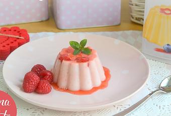 Cubrimos la base de los moldes con sirope de fresa (me encanta el de Mercadona, ya que es un poco espeso y aún se puede ver algo de fruta, además de estar muy bueno). Podemos añadir unos trozos de fresas o frambuesas.