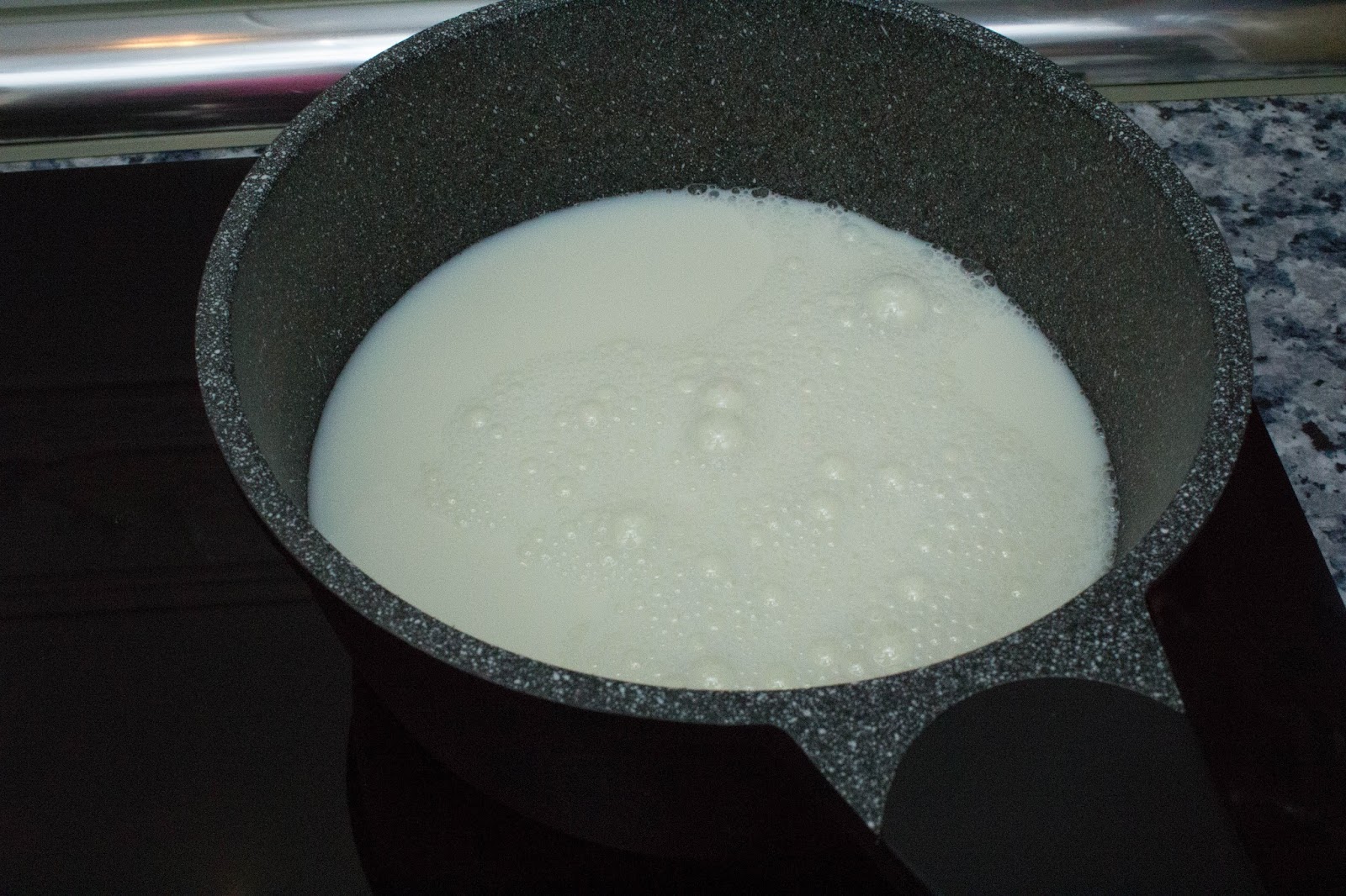 Poner a hervir el resto de la leche en un cazo a fuego lento.