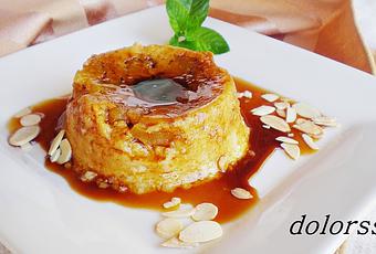 Verter un poco de caramelo líquido en un molde o bien en 6 moldes individuales, repartir la mezcla anterior y cocer al baño maría en horno precalentado a 180º durante unos 40-45 minutos en molde único o bien unos 25 minutos en moldes individuales. Una vez frío y a la hora de servir, desmoldar en un plato y acompañar con las almendras fileteadas tostadas.