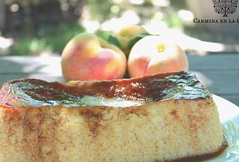 Caramelizamos un molde y lo cubrimos con rodajas de melocotón.
