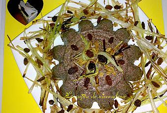 Emplatamos colocando finamente los puerros paja alrededor en forma de nido, unos poquitos hacia un lado y otros hacia el otro, formando una especie de red. Ponemos por encima las pasas y la cebolla frita y calentamos al microondas 5 minutos.