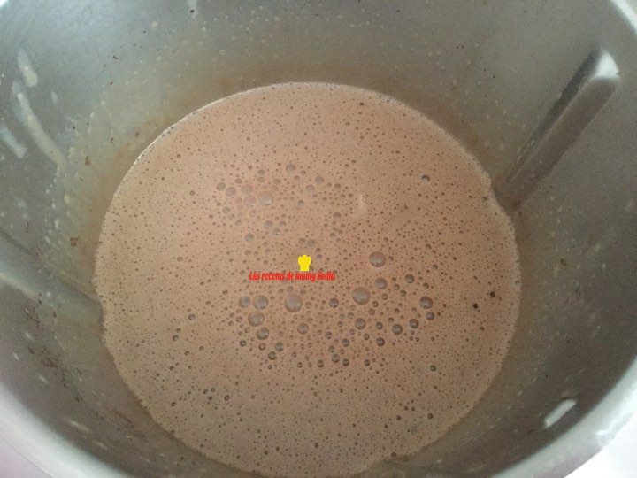 Ponemos la mitad de la nata y de la leche, el sobre de cuajada y el chocolate con leche troceado en el vaso de nuestra thermomix y programamos 7 Min, 90º, Vel 4