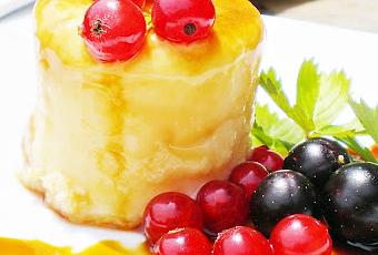 Enriar y desmoldar adornando con grosellas y caramelo líquido.