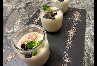 Servir la crema de queso en vasitos de cristal individuales y por encima hacemos con la garrapiñada una especie de polvo de almendra con un mortero. Espolvoreamos por encima de cada vasito, colocamos unas hojitas pequeñas de hierbabuena y unas pasas de corinto caseras.